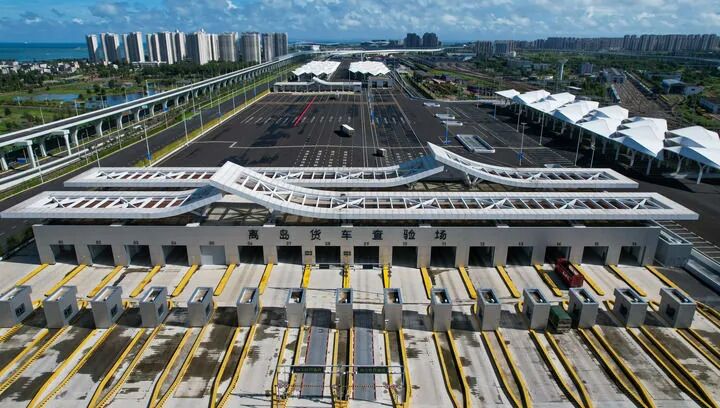 2025年9月17日,离岛货车通过海口新海港和南港“二线口岸”(货运)集中查验场,开往港区(无人机照片)。新华社记者 杨冠宇 摄