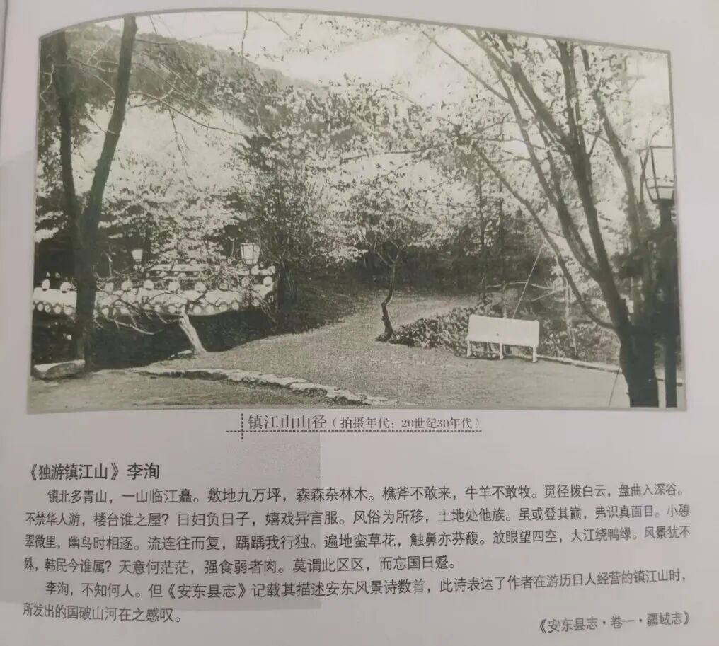 清末,此山是无名荒山。1905年,日俄战争九连城之役结束的第二年,此山一带沦为日本帝国主义“租界地”,从此不准中国人入山樵采放牧。日本僧人细野南岳来到鸭绿江畔,将山改称镇江山,并在山上营建临济寺,用于祭奠日俄战争中丧生的军人亡灵,后来又修建了日本神社、八幡宫等。1912年,日本南满铁道株式会社安东事务所在山上修建公园,为在这里的日本侨民提供娱乐场所,陆续引进日本樱花、松、枞、枫、桃等树木,先后修建了池塘、亭榭、花房、路灯、石径、动物笼等。至1916年公园初具规模,日本樱花盛开,满山葱郁。1918年,曾被东北地区公选为八景之首。公园建成后,成为日本侵略者享乐的地方,每年4月15日—5月15日是樱花盛会,租界地日本人会集于山上参拜神社、饮酒作乐,通宵狂欢。