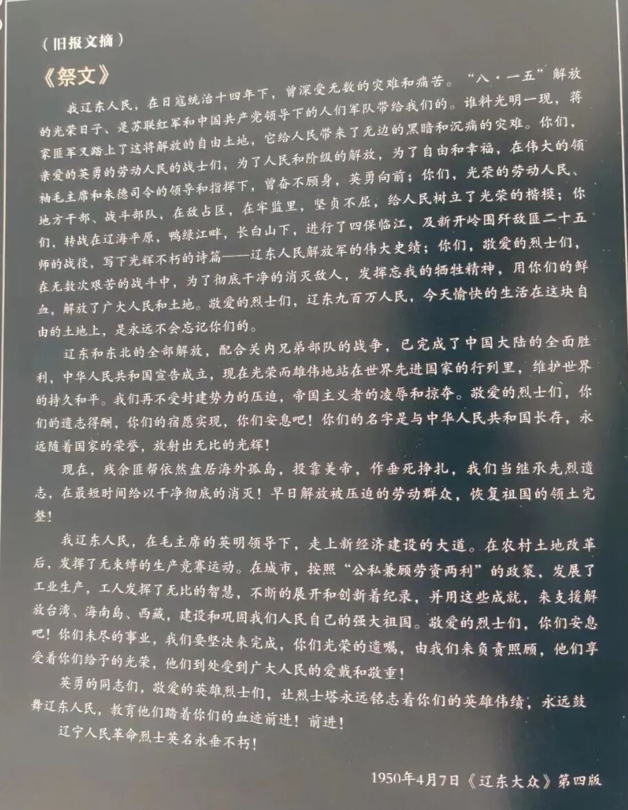 青山无言,绿树无语,观看纪念塔,时间仿佛凝固了一般,让人穿越回到了那段峥嵘的岁月。回到了当初祭奠英烈的场景。旧日报纸上的祭文为证。
