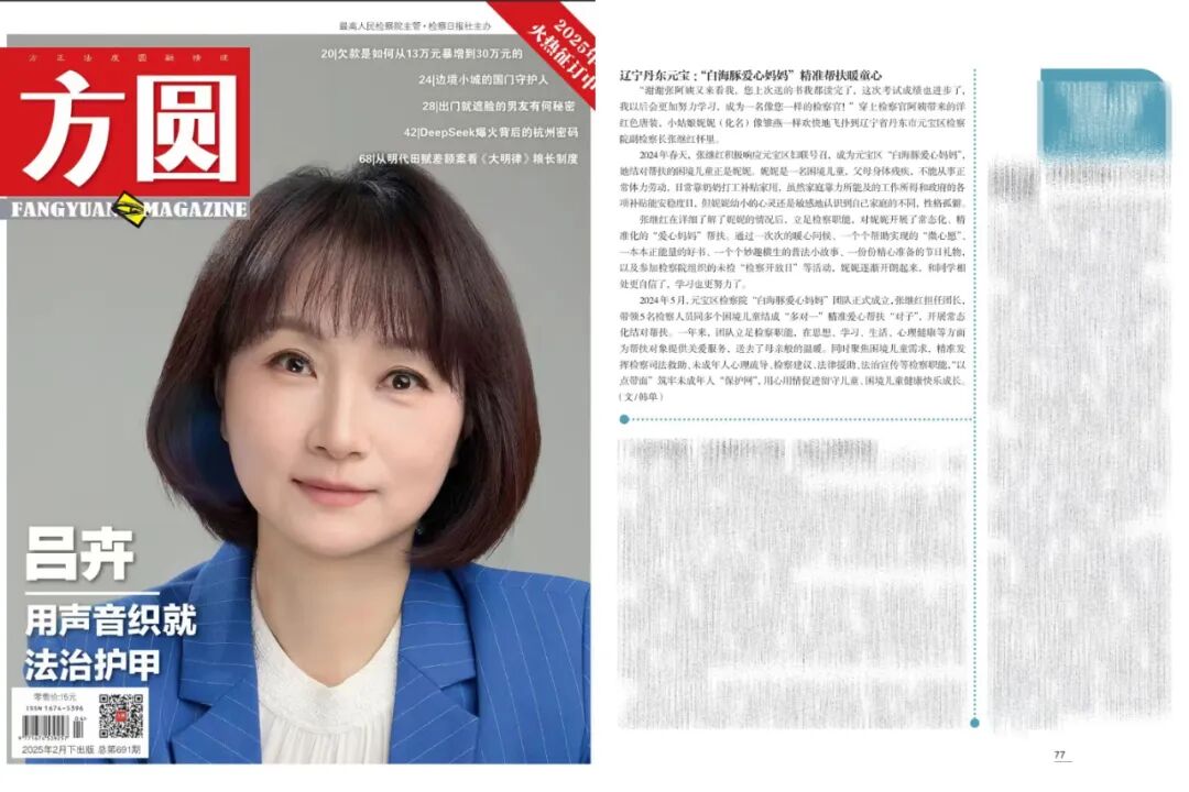近日,最高检主管、检察日报社主办的法治新闻期刊《方圆》杂志(第691期)刊载了《辽宁丹东元宝:“白海豚爱心妈妈”精准帮扶暖童心》一文,全文如下: