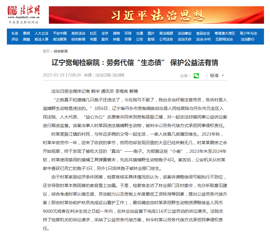 近日,法治日报-法治网刊载了《辽宁宽甸检察院:劳务代偿“生态债” 保护公益法有情》一文,全文如下: