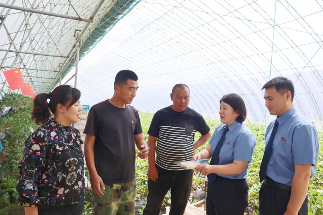 图片为检察官向草莓种植户讲解《土地污染防治法》,推广农膜、农药包装合法处置方式。