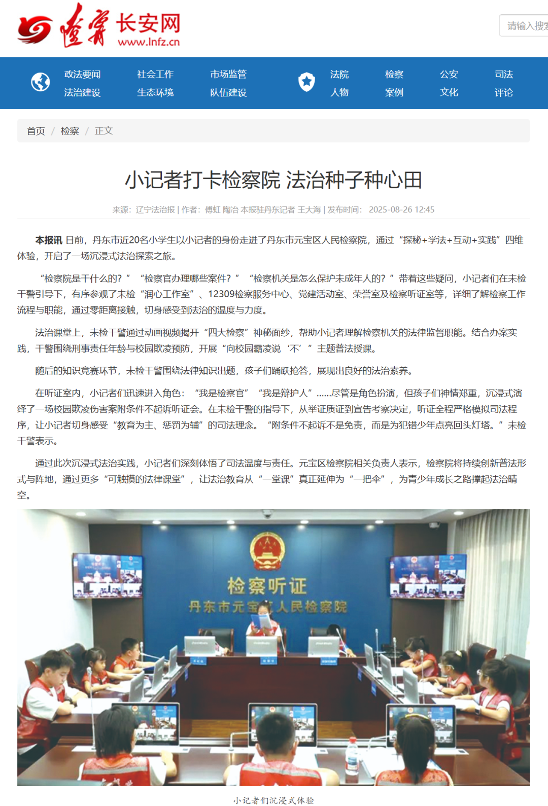 近日,《辽宁长安网》刊登“辽宁丹东元宝检察院:小记者打卡检察院 法治种子种心田”一文,内容如下: