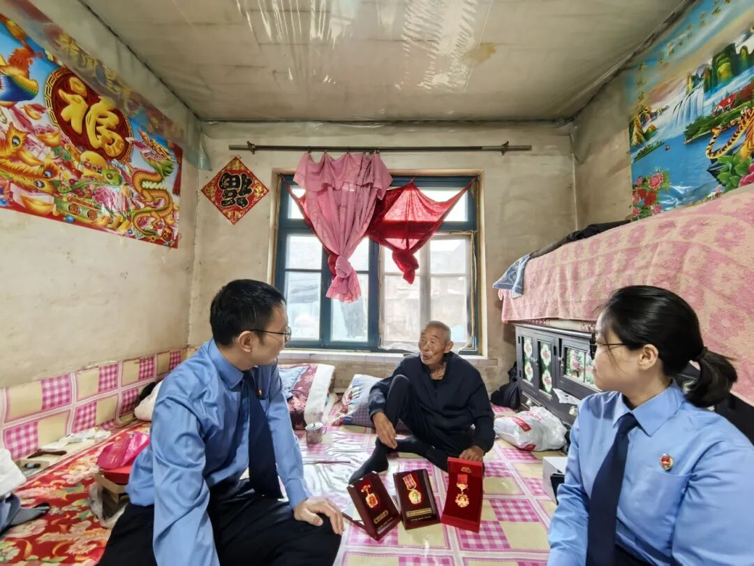 仪式结束后,干警们携带着米面油等慰问品,前往家住大堡乡的抗战老兵家中探望。95岁高龄的老兵得知干警们的知来意后,顿时提起精神来,将包着严严实实的荣誉奖章展示出来,干警们围坐在老兵身旁,一边细心聆听那段尘封多年的抗战记忆,一边轻抚那亮闪闪的荣誉奖章,感受它们沉甸甸的份量。老兵的深情回忆令他们深感责任重大——既要守护当下的正义,更需传承先辈的崇高精神。