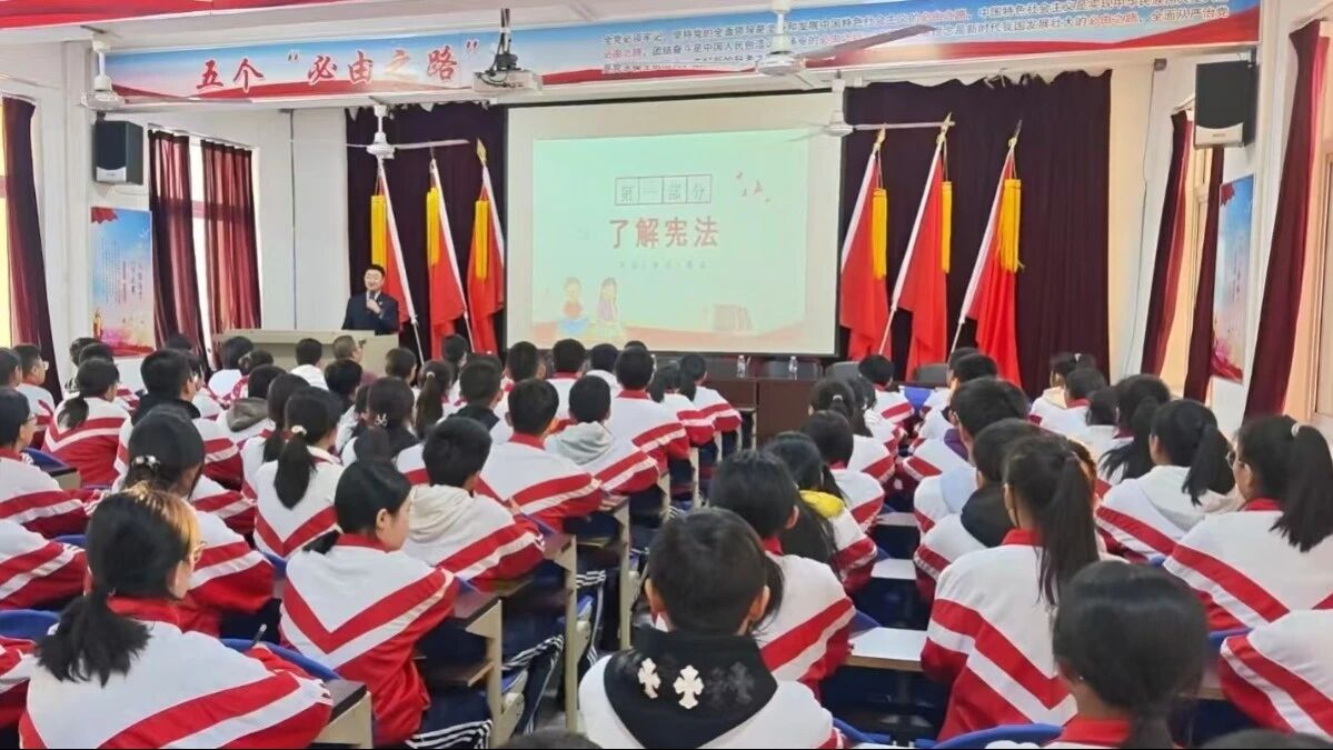 凤城市人民检察院检察干警邓金平走进凤城五中,以“检校共建,法润童心”为主题开展宪法宣传活动,活动中,他设计了顺口溜、法律字谜猜猜猜、知识问答等互动环节,“全国宪法宣传日是哪一天?”“哪位同学可以带领大家读一下这个顺口溜?”......同学们踊跃举手,争相回答,将此次授课气氛推向高潮。授课结束后,凤城市人民检察院扫黑除恶办公室向现场的师生发放扫黑除恶宣传手册,讲解黑恶势力的危害,严防黑恶势力向校园渗透;民事、行政、公益诉讼检察部门则简要介绍各自职能,向学生们传递“法律监督守护美好生活”的理念。