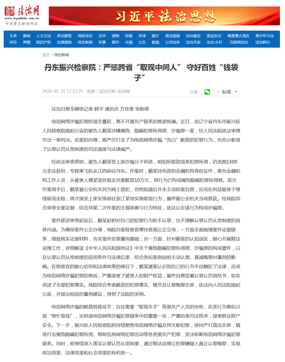 近日,《法治网》刊登《丹东振兴检察院:严惩跨省“取现中间人” 守好百姓“钱袋子”》一文,内容如下:
