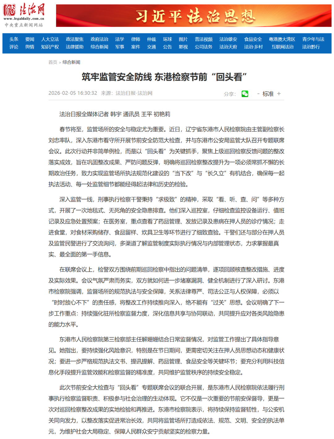 近日,《法治网》刊登“筑牢监管安全防线 东港检察节前‘回头看’”一文,内容如下: